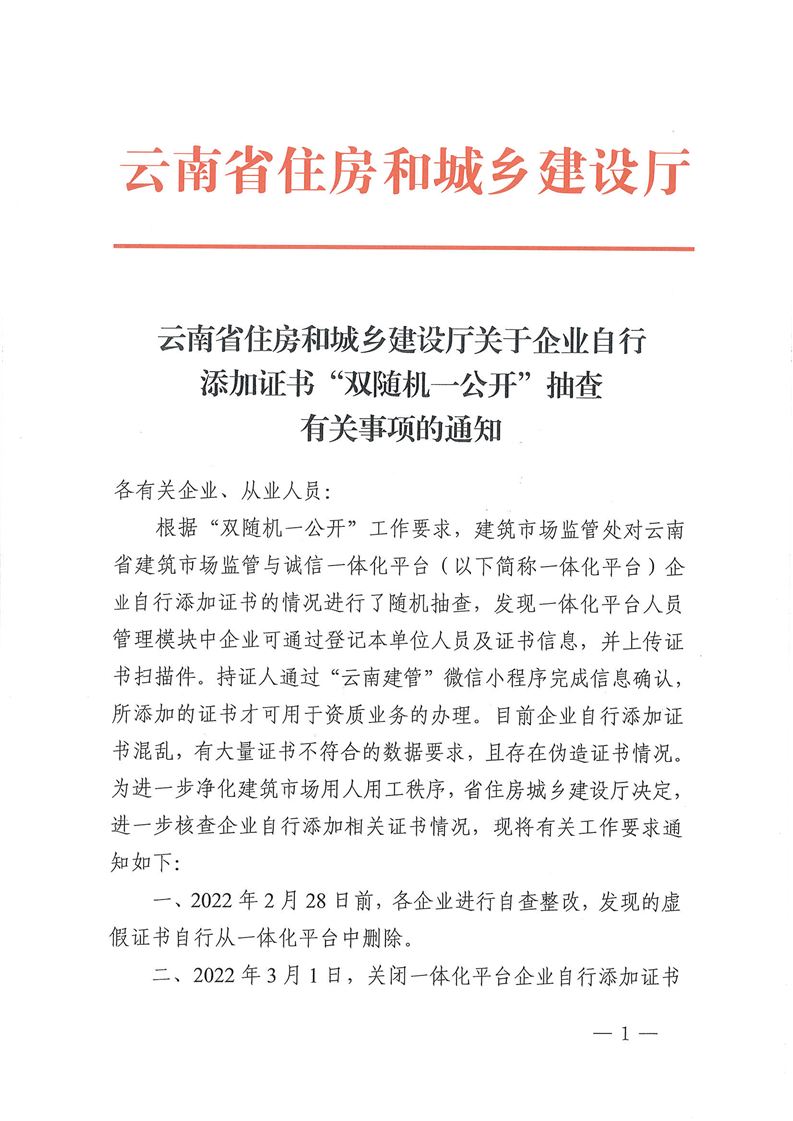 云南省住房和城鄉(xiāng)建設(shè)廳關(guān)于企業(yè)自行添加證書“雙隨機(jī)一公開”抽查有關(guān)事項(xiàng)的通知
