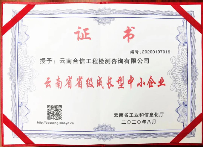 近日,經(jīng)過云南省工業(yè)和信息化主管部門組織推薦、公開申報(bào)、專家評(píng)審、網(wǎng)上公示等程序,云南合信工程檢測咨詢有限公司獲評(píng)”2020年度云南省省級(jí)成長型中小企業(yè)”。